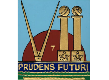 The Lodge Crest shown to the left, is designed with an emphasis on the number 7. It is set on a blue background with a sun shining over the 7 Seas. The base of the Crest is formed of wavy green lines on a blue background to represent the seven seas that were sailed by the mariners using the Port of Dover and the Lodge motto ‘Prudens Futuri’ although no absolute direct translation can be given the closest we can get is ‘Aware of then Future” forms part of the centrepiece. The design uses masonic symbols to represent the Roman numeral for VII with an upturned compass representing the V and the two pillars representing the 2 one’s.
